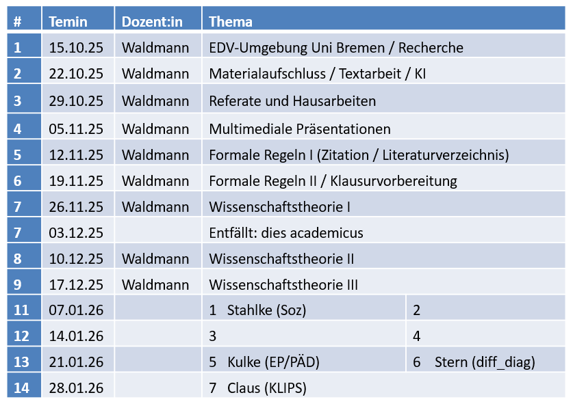 "Handwerkszeug" des wissenschaftlichen Arbeitens vermittelt; Themen und Foliensätze sind weiter
