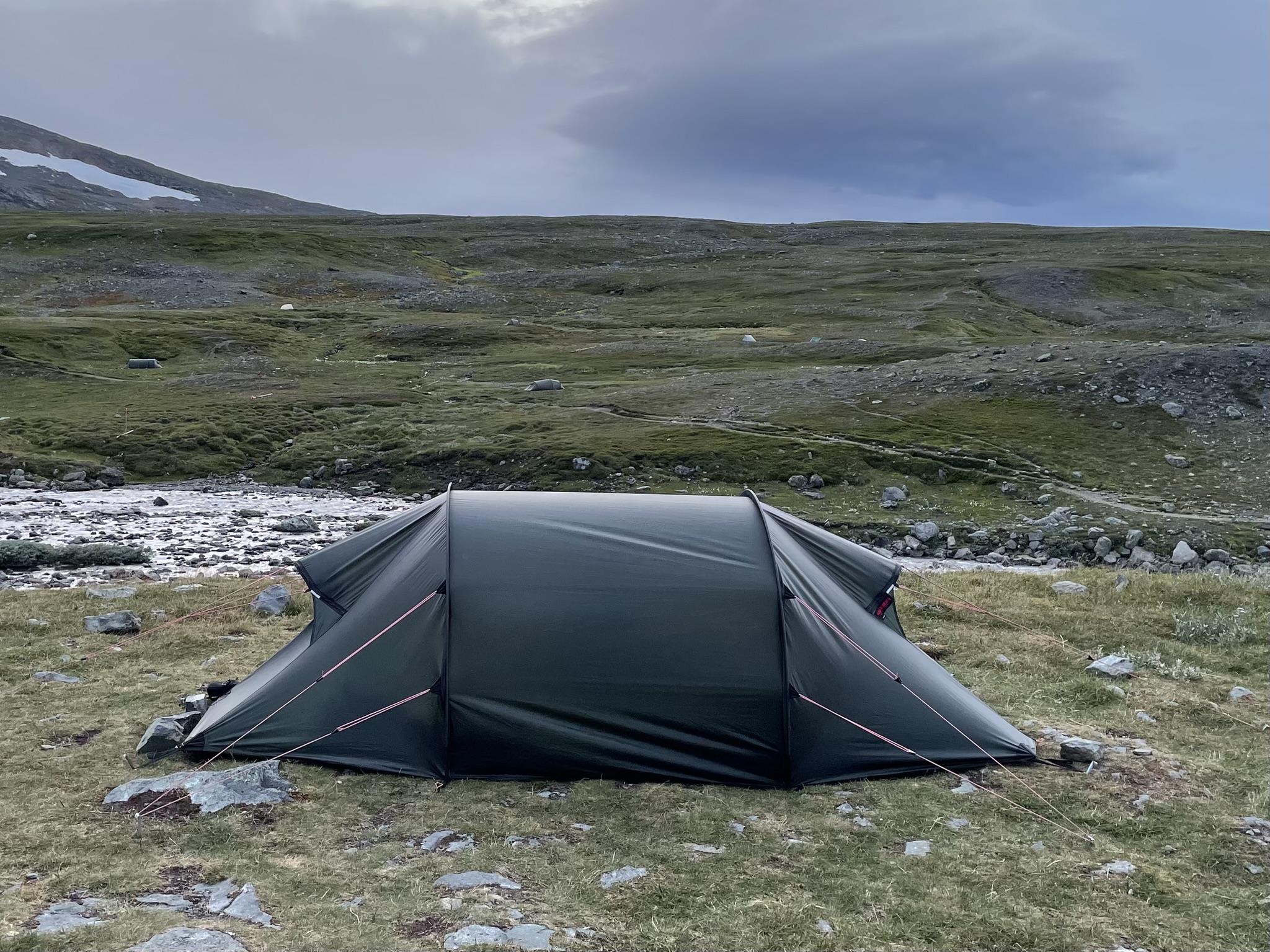 | Windskydd Spaime auf halber Strecke nach Sylarna. Das Zelt (HB Nammatj2) flattert heftig bei gemessenen 8 bft, aber es hält. | |||